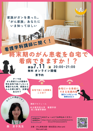 看護師学科の教授である、香川由美子先生をお招きして、がん家族×看護師にまつわるお話しをしていただきます。
