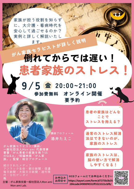 弊社代表の酒井たえこ(がん家族セラピスト)が、患者家族のストレスについてお話しいたします。